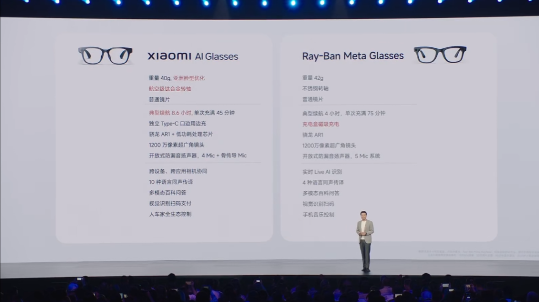 作为小米在AI眼镜赛道的首秀,小米AI眼镜一上来就直接跟行业一哥meta的AI眼镜Ray-Ban meta对标,在雷军的对比PPT中,可以说是“赢麻了”。