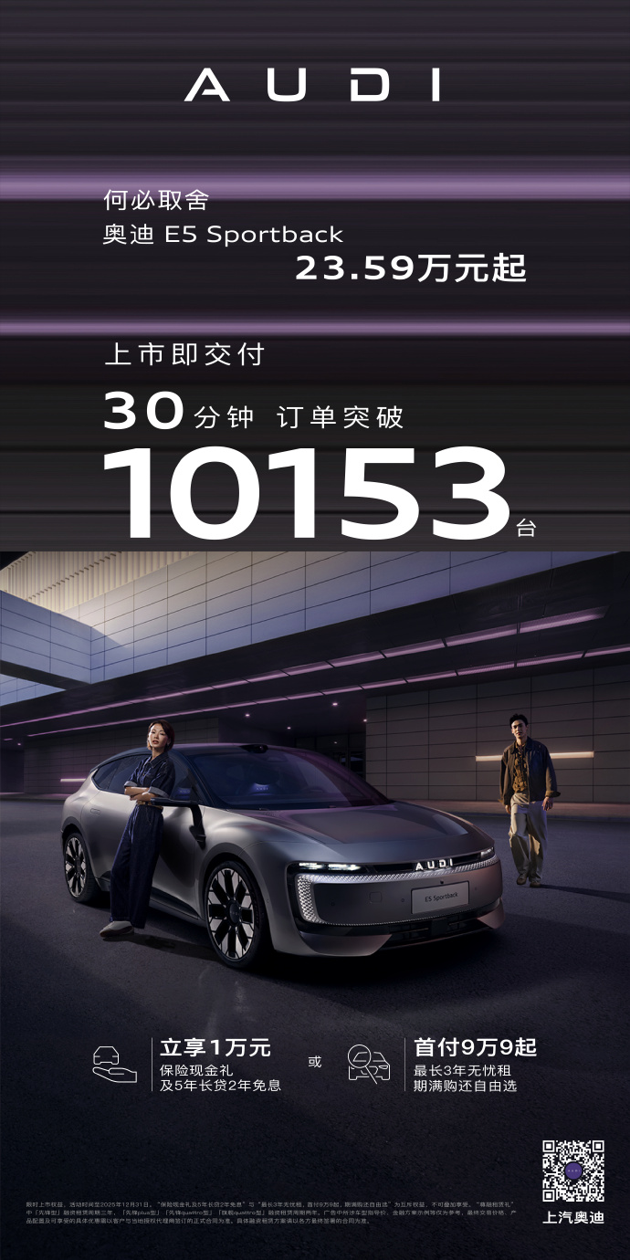 根据官方披露的销售数据,新车上市后仅30分钟便斩获10153份订单,展现出强劲的市场吸引力。作为奥迪与上汽深度合作的结晶,E5 Sportback基于双方联合开发的数字化平台打造,车身尺寸达到4881×1960×1479毫米,轴距2950毫米的规格使其与蔚来ET5 Touring形成直接竞争关系。