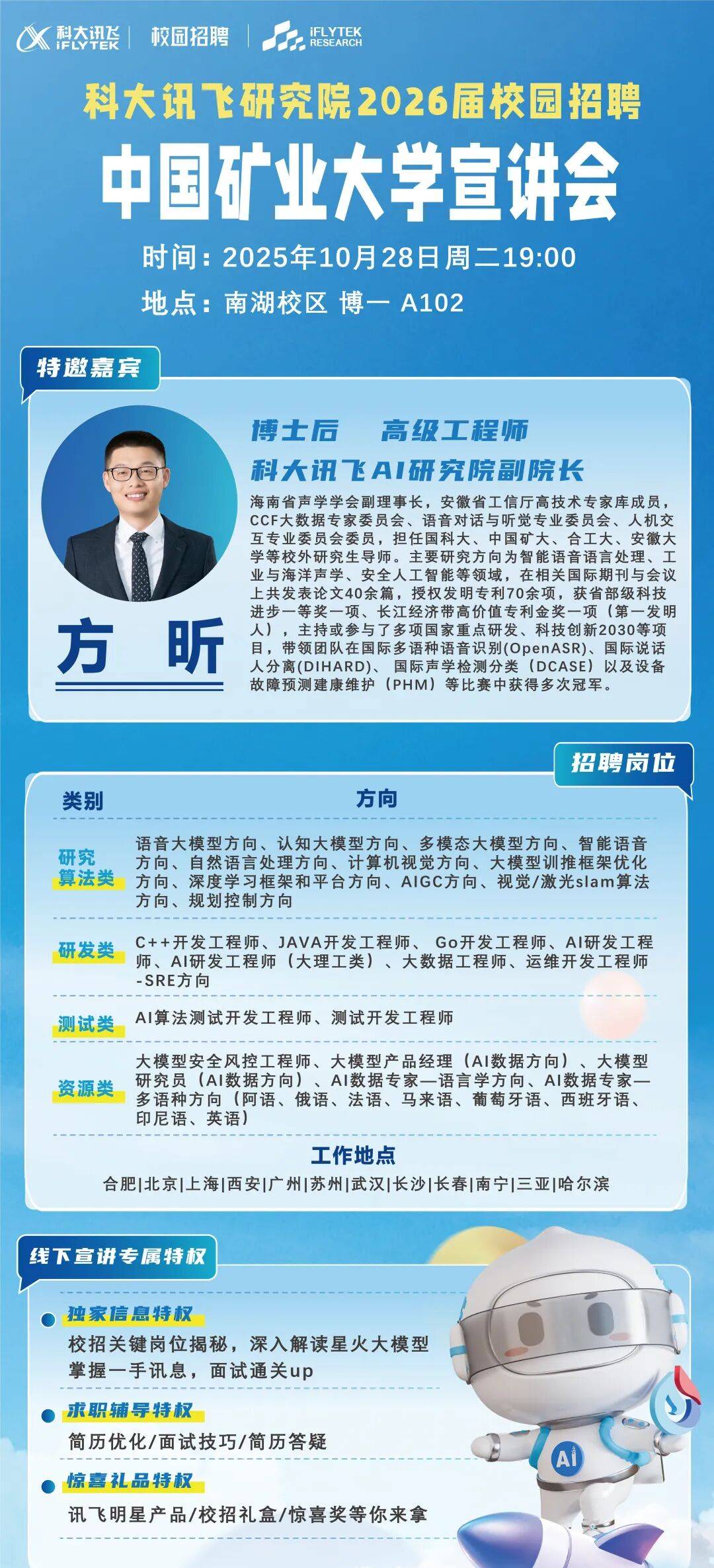 本次宣讲会定于10月28日晚19时在博一教学楼A102教室举行。作为人工智能领域的领军企业,科大讯飞此次招聘将聚焦技术研发、产品管理等核心岗位,为优秀人才提供具有竞争力的职业发展平台。