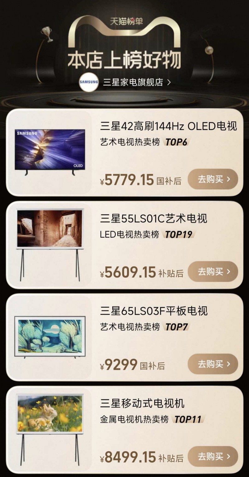 从率先推出Lifestyle艺术电视,以创新产品开启家居美学新赛道,到携手行业协会、平台伙伴共同制定艺术电视2.0标准,引领行业规范化发展,三星在艺术电视领域的每一步,都走在创新与责任的前沿。前往天猫三星家电旗舰店进行选购,体验“科技+美学”带来的生活变革,让高品质艺术生活触手可及。