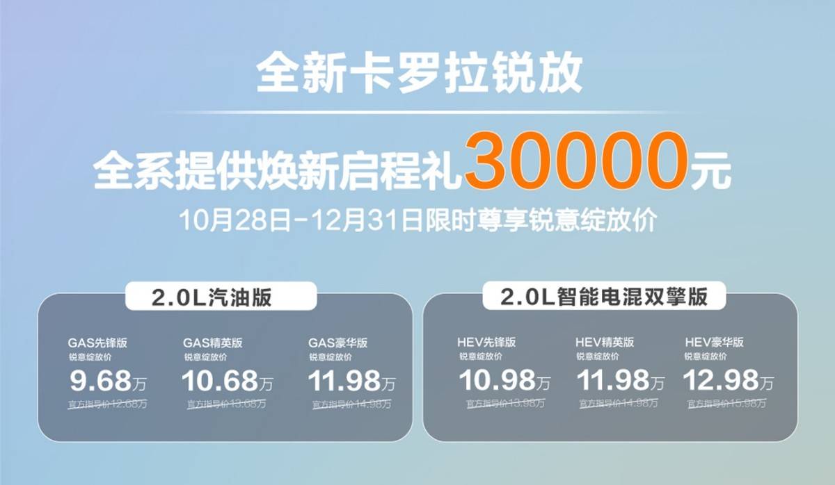 一汽丰田近日推出卡罗拉家族全新成员——卡罗拉锐放,共提供6款配置车型,涵盖2.0L汽油版与2.0L智能电混双擎版两种动力选择。新车官方指导价区间为12.68万至15.98万元,同步推出限时“锐意绽放价”活动,最低售价下探至9.68万元。