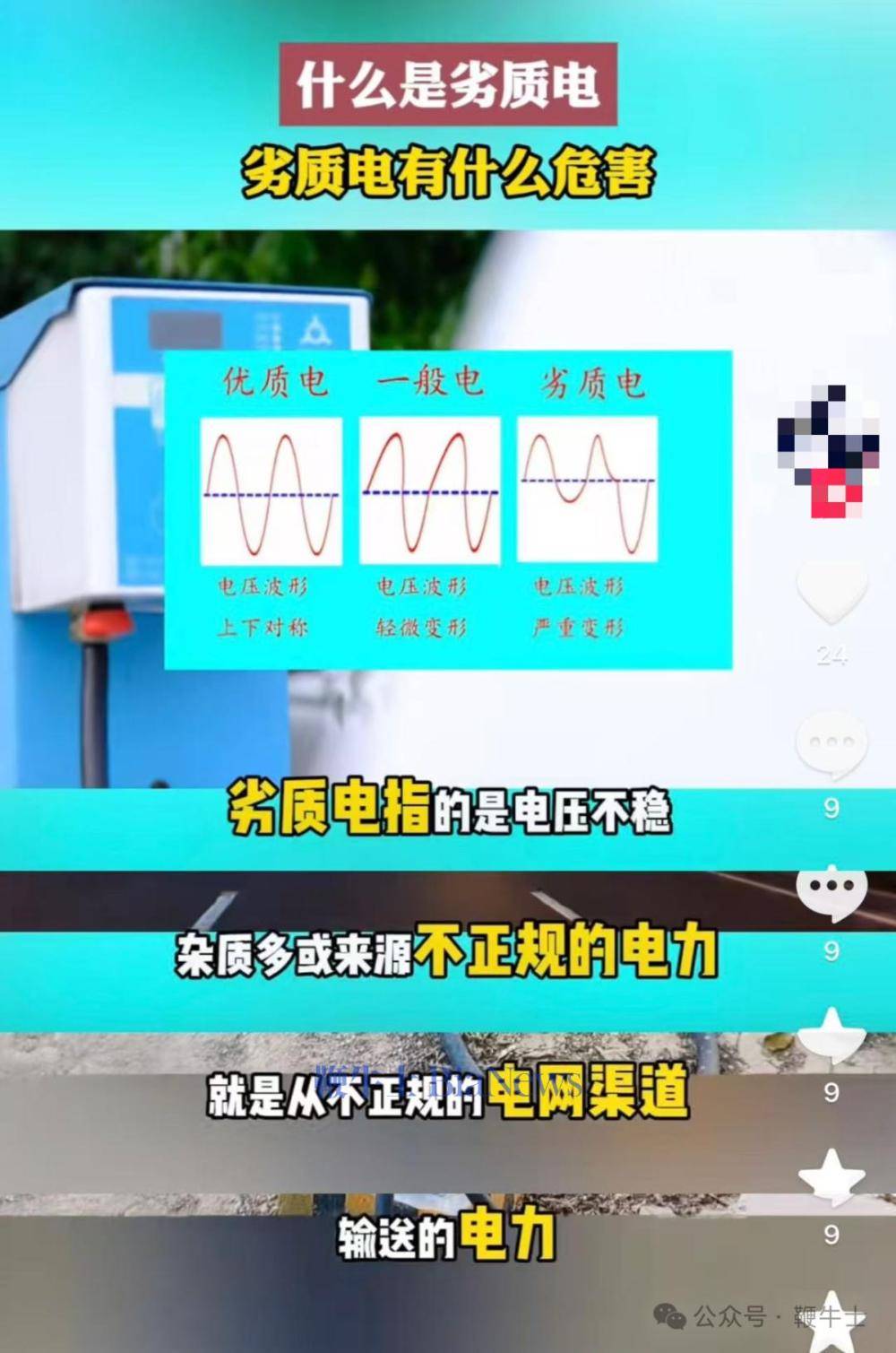 所谓“劣质电”,在网络讨论中呈现出多种解释。有网友声称,这类电力未经过提纯处理,含有铥、镭、铑、鉧等杂质元素;另有观点从技术参数角度定义,认为电压偏离220V标准值(低于192V或高于242V)、频率波动超过50Hz±0.2Hz范围、波形出现严重畸变的电力即为“劣质电”。甚至有视频传播称,这种电力来自非正规电网渠道,价格远低于正规充电站,长期使用会导致设备损坏甚至火灾。