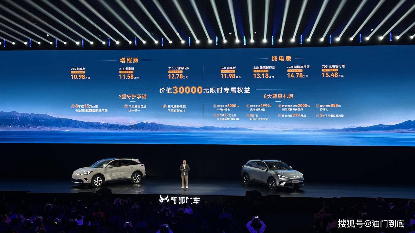 全新阿尔法T5共提供7个版型,包含纯电和增程两种动力形式,售价区间11.38万元至15.88万元,限时优惠价格10.98万元起。随同新车上市,极狐推出了价值3万元限时专属权益,并承诺“三电终身质保、电池自燃烧一赔一、8年或15万公里内电池衰减低于70%只换不修”。