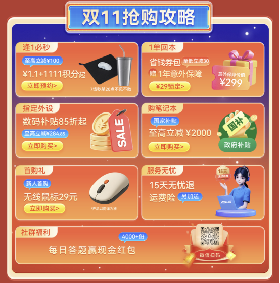 双十一华硕商城大波福利派发中,活动期间下单即享优惠福利,数码补贴补贴85折起,购机赠3年延保+3次远程服务。点击链接,了解更多福利详情!