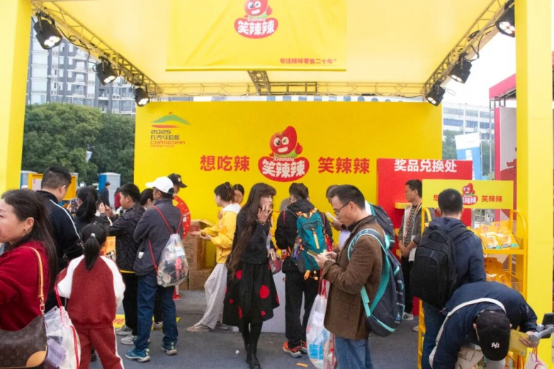 早在10月23日至25日的马拉松博览会上,笑辣辣的暖黄展位就已成为跑者集结的热地,在一众展位中勾勒出温暖而鲜明的视觉记忆点。"想吃辣 笑辣辣" 的暖黄灯牌下,领物选手们的笑声此起彼伏:试吃台前排起长队,筋豆云的醇厚与印度飞饼味的鲜爽交织弥漫,满足不同跑者的味蕾偏好;互动游戏区里,"辣力闯关" 小游戏让等待时光充满乐趣,工作人员笑着为每位参与者送上祝福:"预祝取得好成绩!" 更贴心的是,4万份印度飞饼味产品已提前分装至参赛包中,让这份热辣期待从领物时刻就已启程。