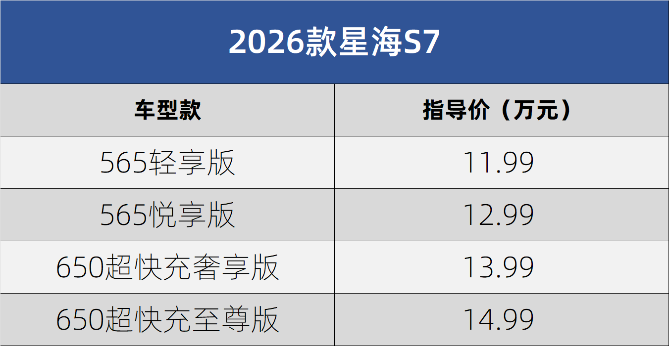 东风风行旗下2026款星海S7近日正式登陆市场,共推出4款配置车型,官方指导价区间为11.99万元至14.99万元。为吸引消费者,品牌同步推出多项购车优惠,包括支付99元订金即可获得价值6万元的权益礼包、置换补贴、原厂配置升级以及金融免息方案。