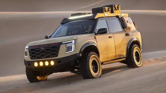 其中,日产Dune Patrol以Armada Pro-4X为基础,被定义为“极端越野赛事的超舒适支援车辆”。这款车搭载了Nismo Off Road专业套件,配备18英寸Nismo防脱轮毂与37英寸泥地轮胎,配合长行程赛车悬挂,确保在复杂地形中的稳定性。车身设计方面,加宽的翼子板、钢制保险杠及多组辅助LED灯,不仅提升了视觉冲击力,更在夜间沙丘越野时提供充足照明。车顶行李架与车内外的储物系统,可满足越野团队携带各类装备的需求。