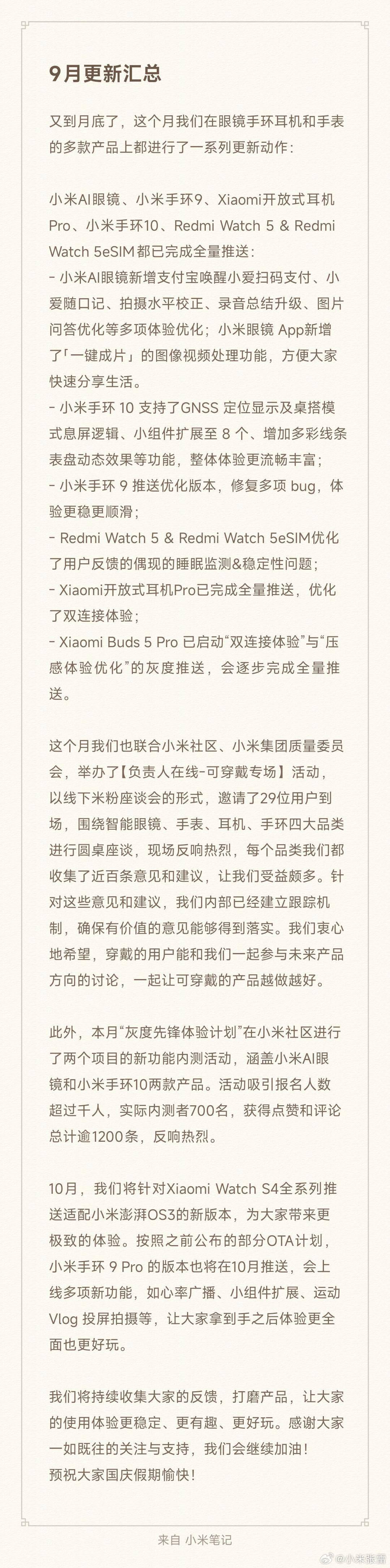 小米集团手机部副总裁、可穿戴业务负责人张雷今日通过社交平台公布了旗下多款可穿戴设备的最新升级进展。据其透露,包括小米AI眼镜、小米手环9系列、REDMI Watch 5系列以及Xiaomi开放式耳机Pro在内的多款产品已完成全量系统更新,用户可体验到功能优化与性能提升。