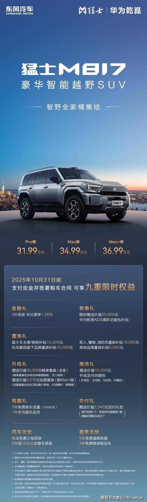 东风猛士科技与华为联合推出的豪华智能越野SUV猛士M817 Max+版正式上市,官方指导价36.99万元。这款长续航新车型不仅补全了猛士M817系列的关键拼图,更通过差异化配置与在售的Pro版、Max版组成最强智能越野产品矩阵,精准覆盖城市通勤、郊野露营、无人区穿越等全场景需求。