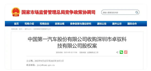近日,国家市场监督管理总局官网披露了一则重要股权交易信息:中国第一汽车股份有限公司计划通过增资方式,收购New Territory所持有的深圳市卓驭科技有限公司70.65%股权。交易完成后,一汽股份将持有卓驭科技35.80%的股份,成为其第一大股东,而New Territory的持股比例则降至34.85%。这一战略布局,标志着传统汽车巨头与智能驾驶新锐企业的深度绑定。