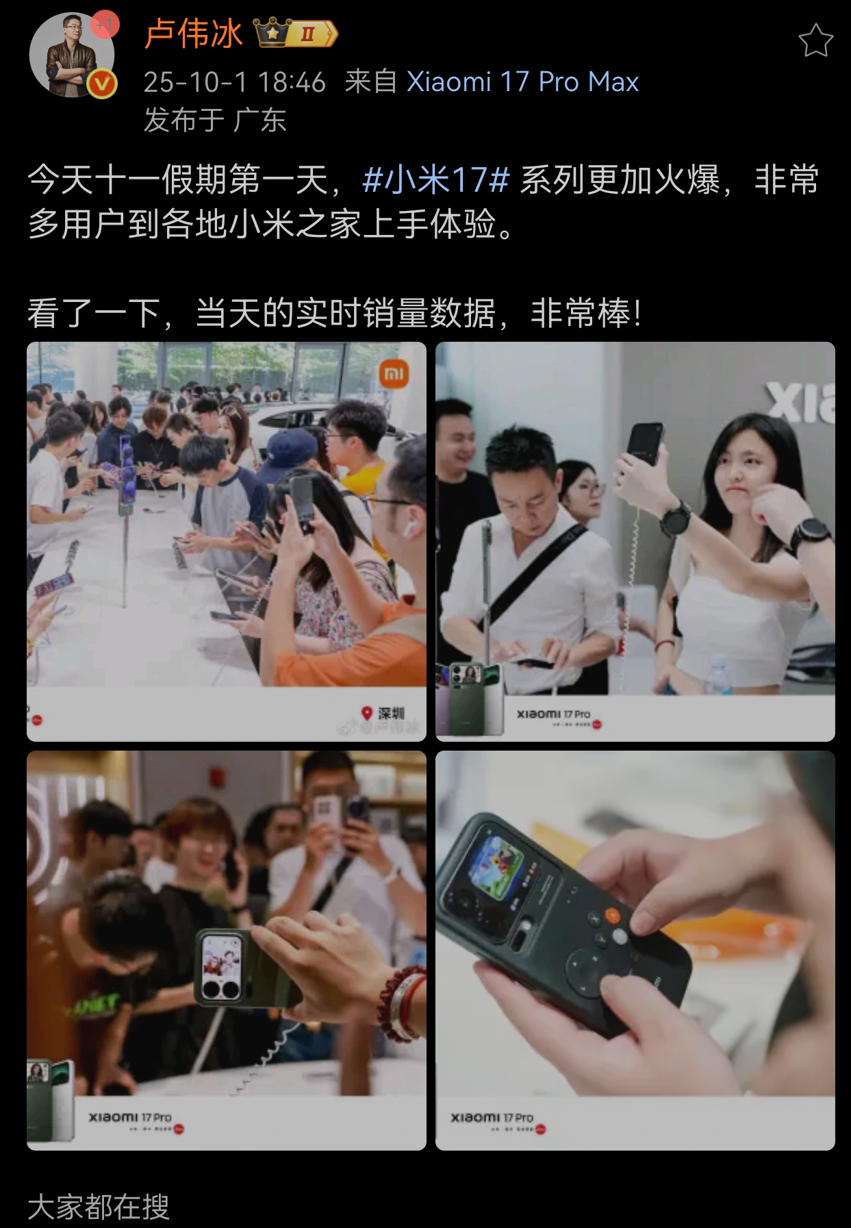小米集团近日迎来销售捷报,其最新发布的小米17系列手机在十一假期首日便展现出强劲的市场表现。据小米集团总裁卢伟冰透露,该系列机型在首销当日即取得“非常棒”的销售成绩,引发行业广泛关注。