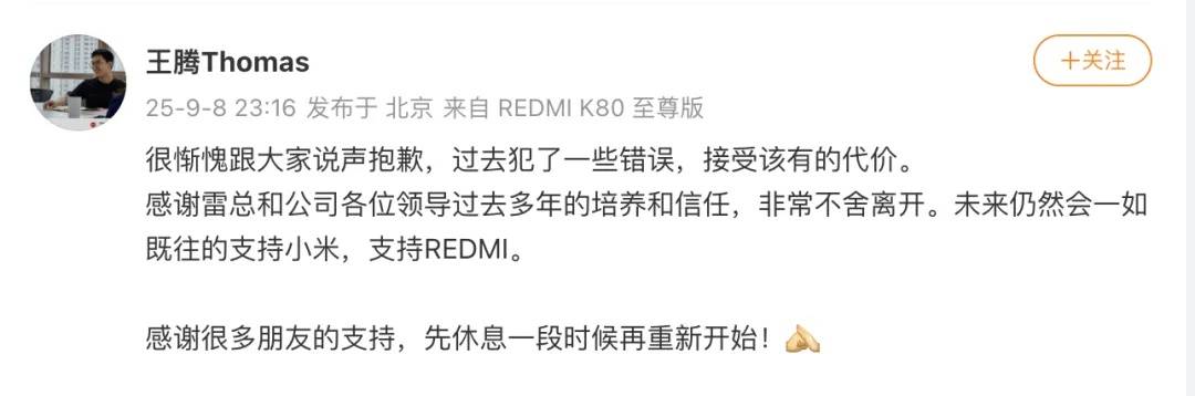 9月25日雷军年度演讲的高管名单中,王腾名字首次缺席,而其微博动态显示正在观看直播。这种"在场与缺席"的微妙状态,成为观察科技企业人才管理机制的一个典型案例。目前小米尚未就后续人事安排作出公开说明,行业持续关注事件后续发展。