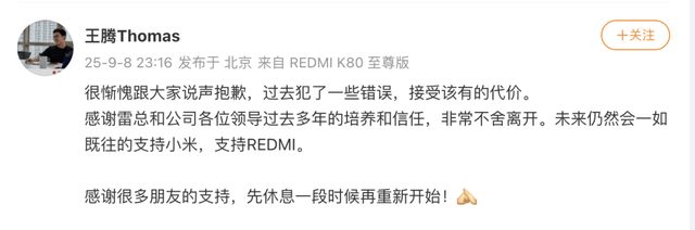 王腾多平台账号现异常,此前因泄露机密及利益冲突遭小米辞退