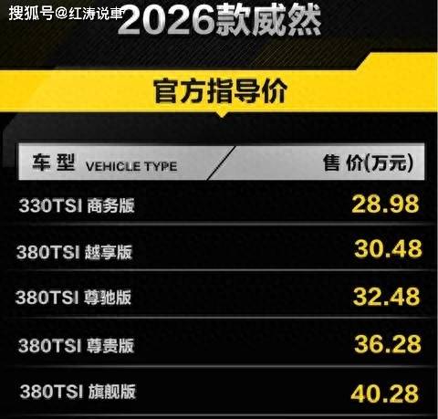 作为年度改款车型,2026款威然在外观和内饰设计上延续了前代车型的风格,但车型配置有所调整。其中,330TSI豪华版被取消,取而代之的是新增的380TSI越享版车型,为消费者提供了更多选择。动力方面,新车继续搭载高低功率版本的2.0T发动机,满足不同消费者的驾驶需求。