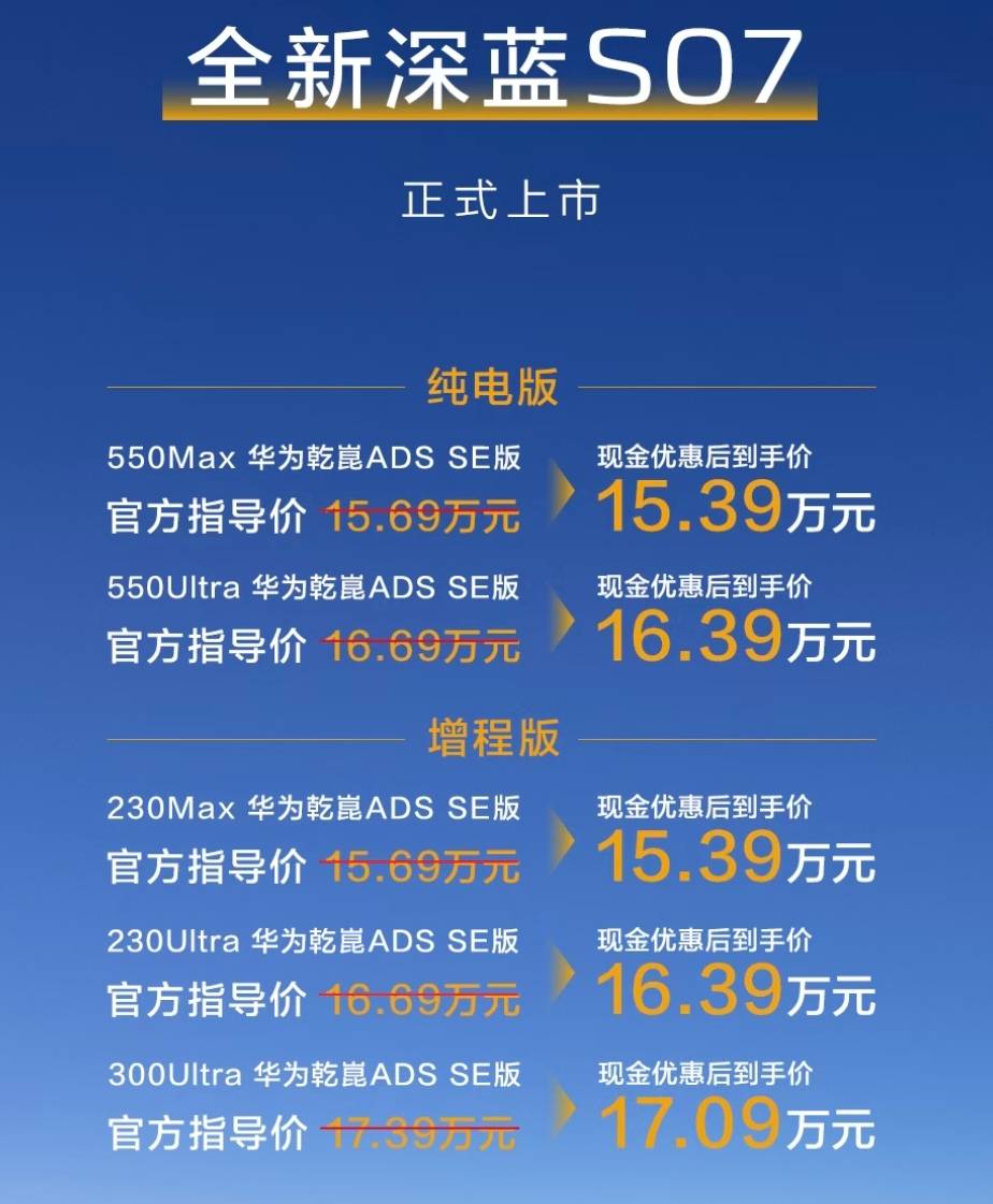 深蓝汽车也选择在同一天推出全新深蓝S07,起售价15.39万元。此前该车已开启预售,价格区间为15.69-17.39万元。面对竞争加剧的市场环境,深蓝S07通过增程+纯电双版本布局和全面升级来巩固市场地位。新车外观新增驰光黄配色,提供五种车漆和双色车身选择,纯电版与增程版通过细节设计进行区分。