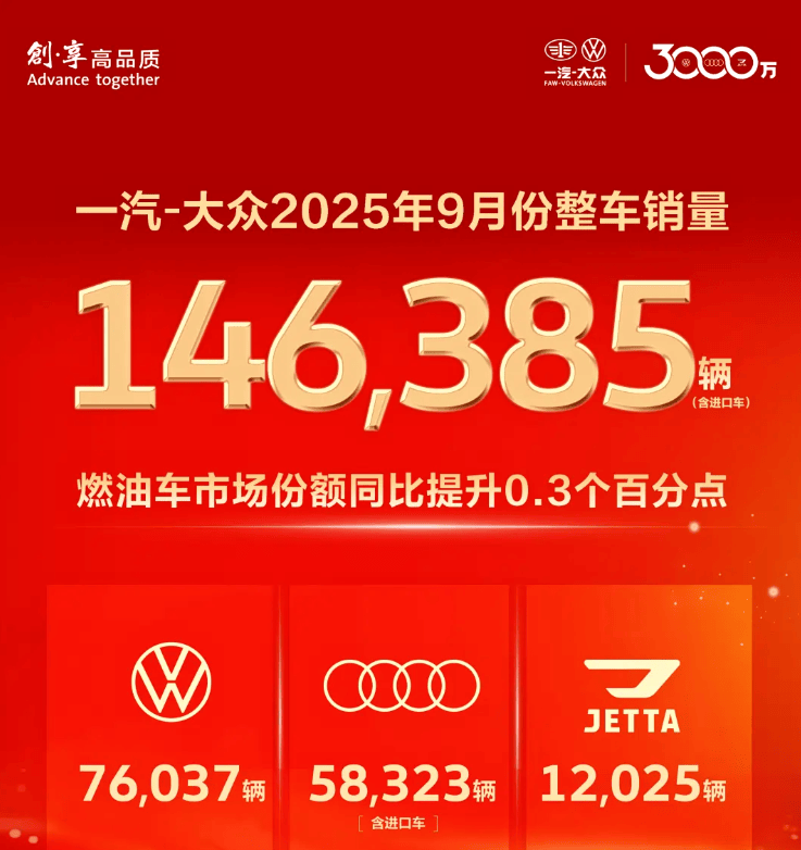 面对新能源汽车市场渗透率不断攀升的挑战,一汽-大众以稳健表现交出亮眼成绩单:9月实现整车销售146385辆(含进口车),燃油车市场份额同比上涨0.3个百分点,同时即将迎来第3000万辆整车下线的里程碑时刻。在行业深度变革期,这家传统车企通过产品迭代与技术突破,实现了燃油车与新能源业务的协同发展。