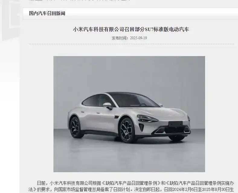 近期,小米汽车在市场上表现活跃,9月交付量突破4万辆,旗下小米YU7车型交付量也稳步提升。然而,此前小米SU7因召回11万辆车辆引发关注,市场监管总局主管媒体《产品可靠性报告》旗下账号“中国质量报告”指出,此次召回并非常规OTA升级,而是因调查后被动实施,这一消息让小米汽车一度处于舆论风口。