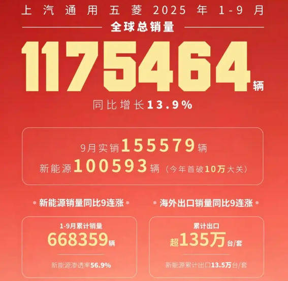 上汽通用五菱最新公布的销量数据显示,企业在新能源领域与整体市场均呈现强劲增长态势。9月单月实现销量155579辆,其中新能源汽车单月销量首次突破10万辆大关,达到100593辆,成为当月最大亮点。