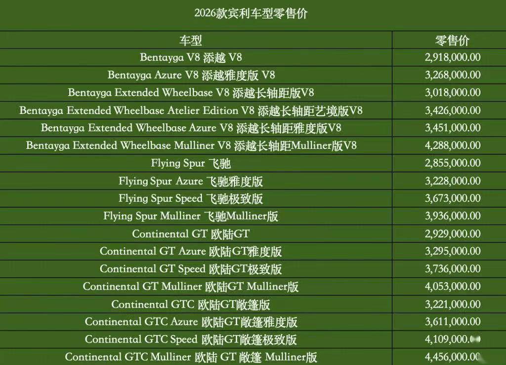 近日,宾利汽车正式推出2026款全系车型,涵盖添越、飞驰及欧陆GT三大产品线。其中,新款添越提供6款配置,售价区间为291.8万元至428.8万元;飞驰系列推出4款车型,定价285.5万元至393.6万元;欧陆GT则以8款车型阵容亮相,售价292.9万元至445.6万元。