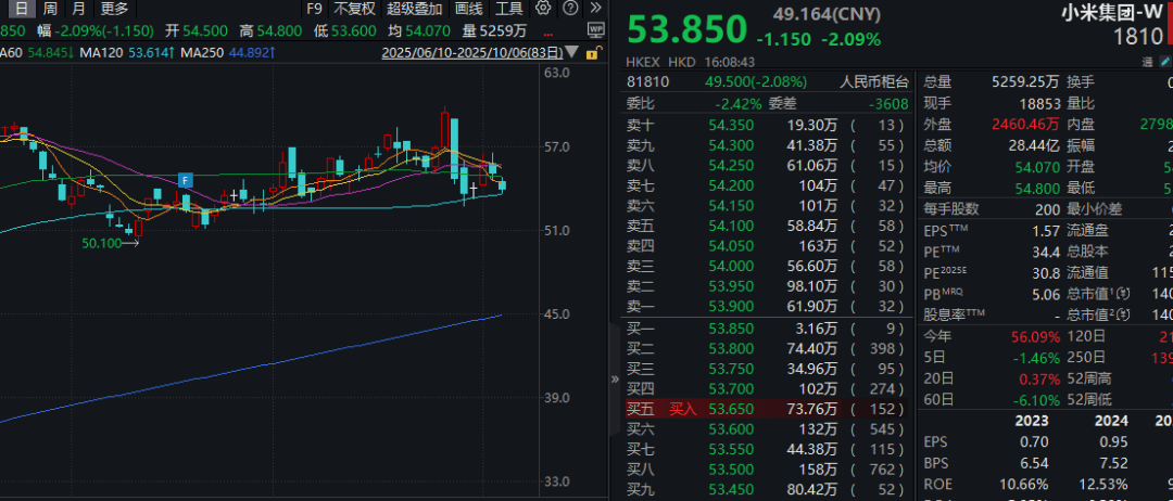 尽管产品端表现强劲,小米集团在资本市场的走势却相对平淡。10月6日,小米集团-W股价下跌2.09%至53.85港元。进入10月以来,该股累计跌幅0.28%,同期恒生指数与恒生科技指数分别上涨0.38%和1.31%,形成对比。