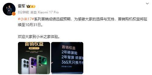 小米创始人雷军今日通过社交平台发布消息,宣布小米17系列手机首销成绩超出预期。他在微博中透露,为回馈消费者的支持,原定于近期结束的首销购机权益将延长至10月31日。