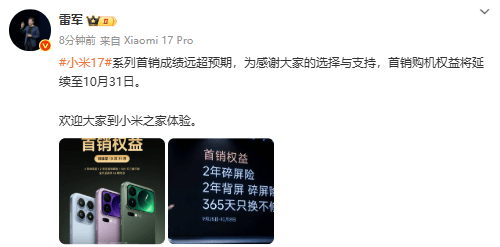 据雷军发布的公开信息显示,为回馈消费者对产品的热情支持,小米官方决定将首销期间推出的专属购机权益延长至10月31日。该权益包含多项增值服务,具体内容可通过小米官方渠道查询。