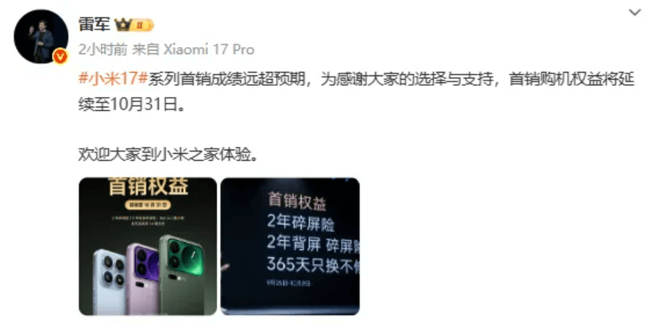 小米集团创始人雷军近日通过社交媒体宣布,小米17系列手机首销成绩显著超出预期,消费者购机权益将延长至10月31日。此前,该系列机型开售仅5天便创下销量突破100万台的纪录,雷军本人曾转发央视新闻相关报道予以确认。