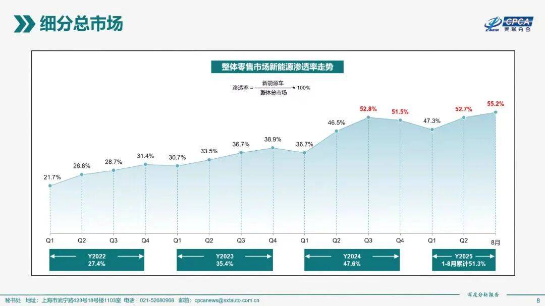 根据不同统计维度,新能源渗透率呈现三种主要结果。其一,以汽车总销量(含出口和商用车)为基准,8月批发销量中新能源占比48.83%,其中传统燃油车销量为146.2万辆,纯电和插混(含增程)分别为90.8万辆和48.7万辆,比例约为51:32:17。其二,聚焦国内市场(不含出口但含商用车),新能源渗透率升至52.16%,燃油车销量107.4万辆,纯电和插混国内销量分别为76.5万辆和40.6万辆,比例简化为48:34:18。其三,若仅统计乘用车国内零售销量(不含出口和商用车),新能源渗透率达55.19%,其中燃油车销量89.4万辆,纯电、狭义插混和增程分别为68.6万辆、31.4万辆和10万辆,比例约为44:35:16:5。