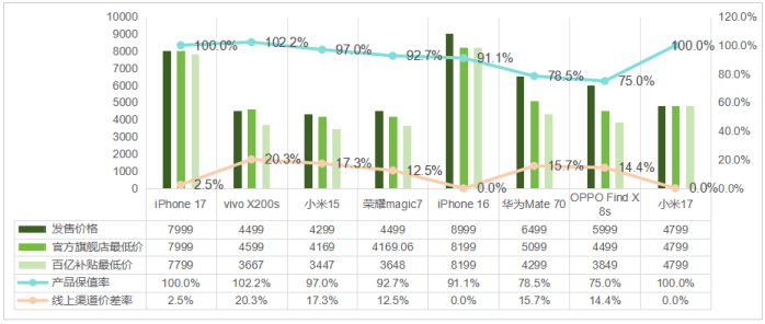 内存配置方面,本次监测统一采用512GB版本作为样本,确保数据横向可比性。价格计算模型显示,保值率采用"官旗最低价/发售价"公式,渠道价差率通过"(官旗最低价-百补最低价)/官旗最低价"计算得出。这种标准化处理方式,有效消除了不同机型配置差异对价格分析的影响。