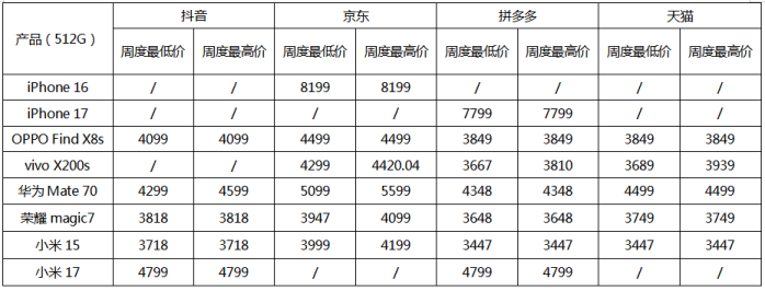 电商平台价格竞争呈现"京东领涨,拼多多领跌"的格局。监测数据显示,京东平台成为8款机型最低价的主要产生地,但价格波动最为剧烈,其中华为Mate70单周最高跌幅达400元。拼多多则凭借百亿补贴优势,成为价格洼地集中地,除小米17新品外,其他机型在该平台均出现不同程度降价。特别值得注意的是,国庆假期成为价格调整分水岭,华为Mate70在天猫平台单周暴跌800元,创下本周最大跌幅纪录。