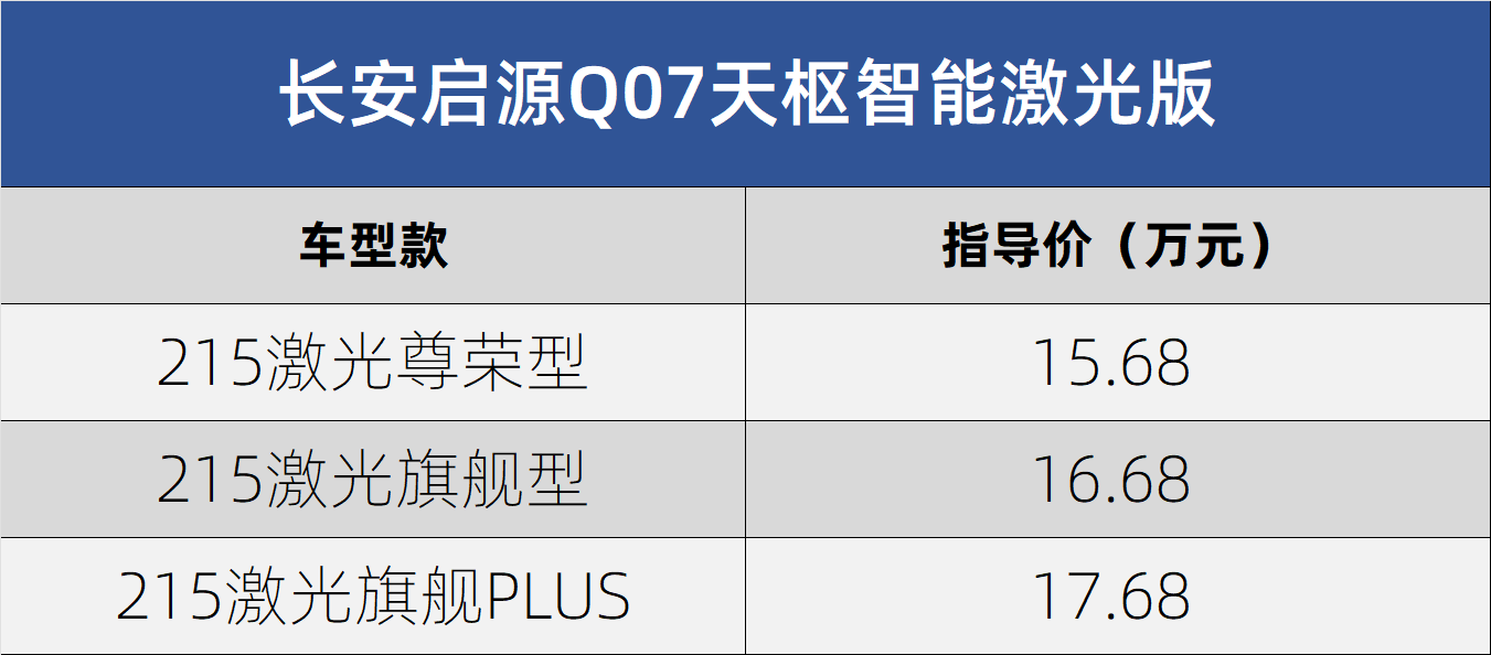 长安启源Q07近日推出驾驶辅助激光版车型,共推出三个配置版本,官方指导价区间为15.68万元至17.68万元。新车最大亮点在于搭载激光雷达模块,支持更高级别的智能驾驶辅助功能,同时延续了现款车型的设计语言与核心技术配置。