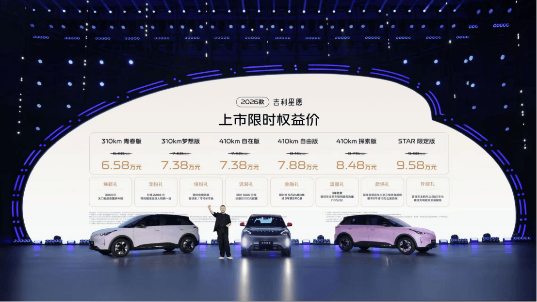 在杭州举办的2025吉利汽车用户大会上,2026款吉利星愿正式亮相并开启销售。新车推出6款配置车型,限时权益价区间定在6.58万元至9.58万元之间。这场发布会不仅展示了新品,更被视为吉利对未来纯电小车市场格局的一次重要宣言。自去年上市以来,吉利星愿凭借精准的市场定位和极具竞争力的价格策略,迅速在A0级纯电市场占据一席之地。数据显示,今年9月单月销量突破5万辆,上市一年累计销量超过40万辆,成为当之无愧的车圈爆款。