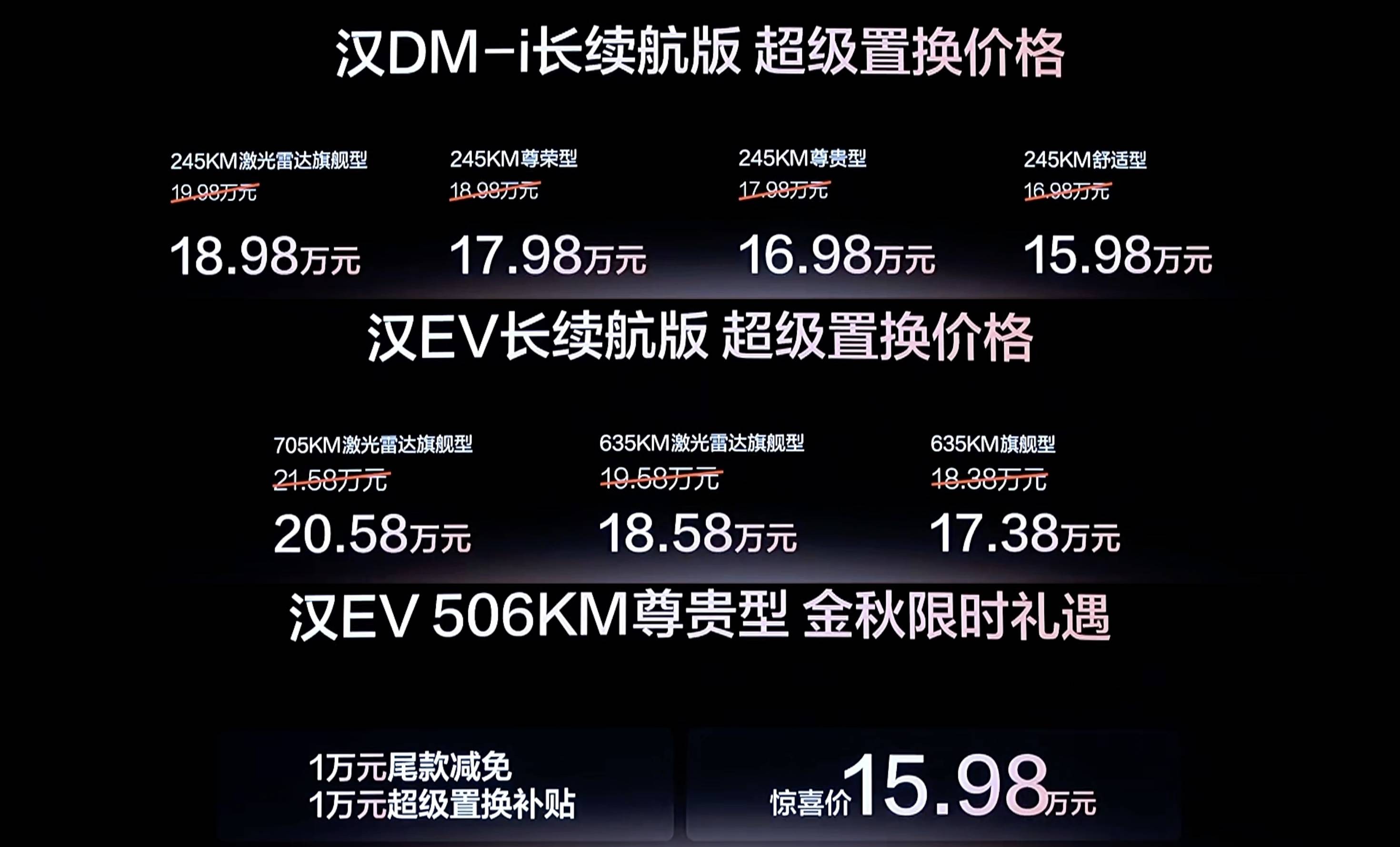 比亚迪汉长续航版正式登场,此次共推出DM-i与EV两大系列车型,为消费者带来更多元化的选择。其中,DM-i长续航版一次性推出四款配置,售价区间锁定在16.98万元至19.98万元之间;EV长续航版则提供三款车型,售价区间为18.38万元至21.58万元。更令人心动的是,所有车型均享有1万元的置换补贴优惠,而汉EV 560KM尊贵型更是推出限时特惠价,仅需15.98万元即可拥有。