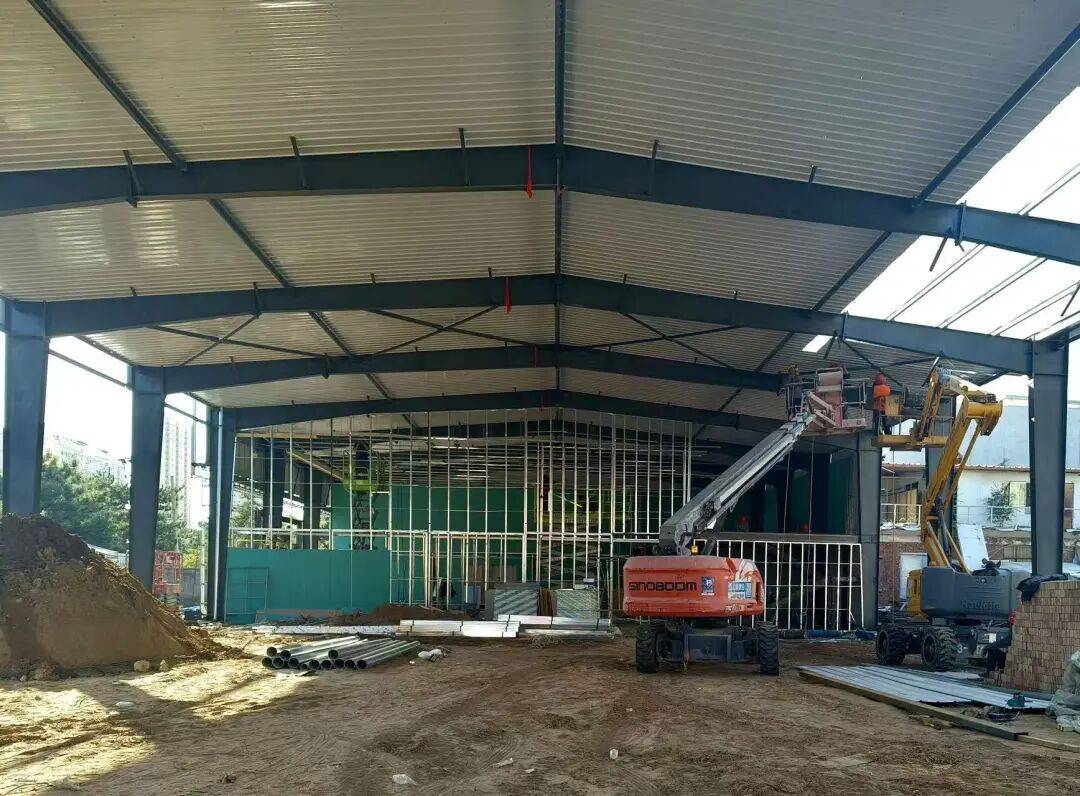 在稀土高新区汽车商业街,中晟新能源汽车城项目施工现场呈现出一派热火朝天的建设景象。巨大的钢结构顶棚已搭建完成,宛如一把巨型遮阳伞,施工人员在高空作业平台上,专注地进行着封顶前的收尾工作。