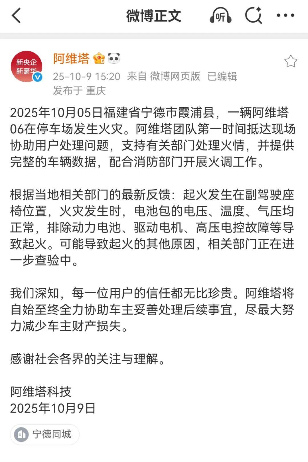 针对网络质疑,阿维塔官方于10月9日发布声明,明确指出起火点位于副驾驶座椅位置。根据当地相关部门初步调查,火灾发生时电池包电压、温度、气压均处于正常范围,动力电池、驱动电机及高压电控系统未出现故障,排除电池相关因素。目前,相关部门正对其他潜在起火原因展开深入排查。