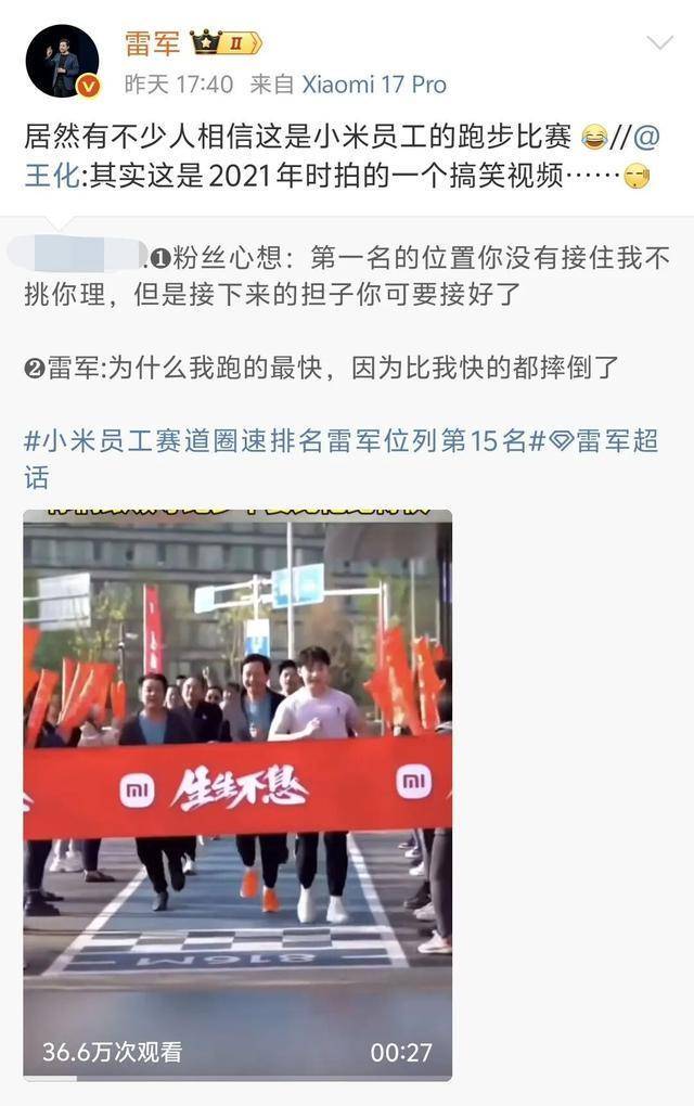 对此,小米公关总经理王化迅速出面澄清,明确表示该视频拍摄于2021年,本质是一个内部搞笑短片,并非真实比赛记录。随后,雷军本人也转发相关微博,并幽默回应:“居然有不少人相信这是小米员工的跑步比赛。”