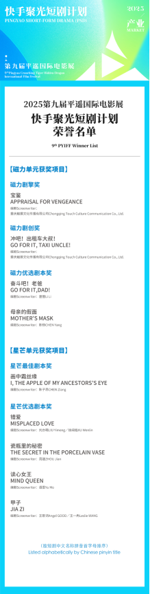 9月29日,第九届平遥国际电影展“平遥之夜”荣誉盛典盛大举行,揭晓本届影展官方展映单元各项荣誉的最终得主。共8部作品从“快手聚光短剧计划”入围项目中脱颖而出。其中,在磁力单元,《宝鉴》获得磁力剧擎奖,《冲吧!出租车大叔!》获得磁力剧创奖,《奋斗吧!老爸》《母亲的假面》获得磁力优选剧本奖。在星芒单元,《画中霜丝缘》获得星芒最佳剧本奖,《错爱》《瓷瓶里的秘密》《读心女王》《甲子》获得星芒优选剧本奖。