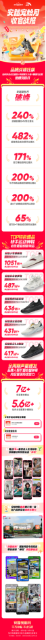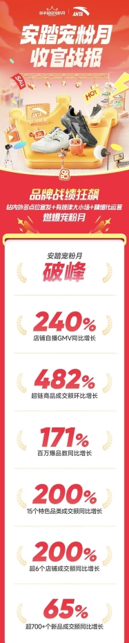 数据显示,8月8日-9月17日活动期间,安踏宠粉月活动整体曝光突破7亿,安踏品牌成交破峰。其中店铺自播GMV同比增长240%, 超6个店铺成交额同比增长200%,15个特色品类成交额同比增长200%。超级链接商品成交额环比增长482%,百万爆品数同比增长171%,超700个新品成交额同比增长65%。