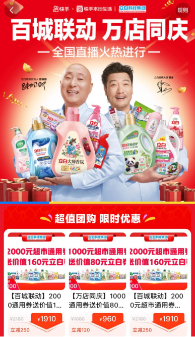 在本地团购场景内,快手助力立白打造本地“百城联动”团购节,让品牌对百城万家的洁净守护真正走进用户生活,本地经营活动周期助力转化交易突破4亿,百城联动合作超市品牌223个,全国覆盖门店1747家。快手站内搭建起立白“百城联动 万店同庆”本地团购节主会场,并合作区域达人、联动品牌直播,串联起内容种草、直播转化、本地团购的闭环链路,使用户体验由内容情感共鸣向生活服务拓展,助力品牌以线上曝光引燃线下生意增量。
