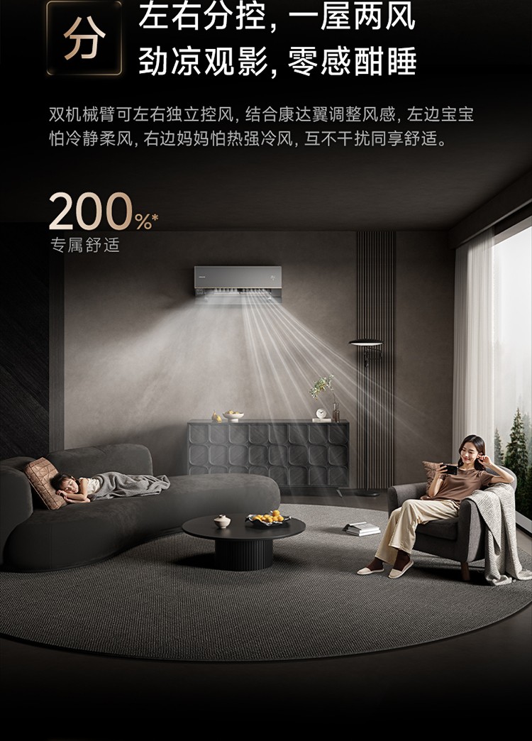 如果说0°零感微风和126°广域送风是追觅机械臂空调成功敲开空调市场大门,那么得益于双机械臂设计的左右分控,一屋两风,互不干扰则将用户体验提升到新档次。以往传统空调统一风感模式,家庭用户矛盾不断!强风模式,老人怕冷用户受不了。柔风模式,家里怕热的男士又感觉不够热,这就导致不管空调怎么设置,家庭成员总有人不舒服。