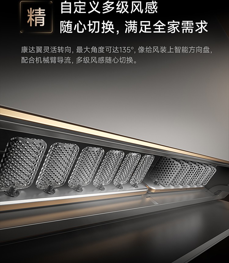 而且这款空调康达翼能135°灵活调节,犹如为空调装上了方向盘,可以任意调整方向,形成包括90°澎湃劲风、45°自然柔风和0°零感微风等三种不同的风感模式。