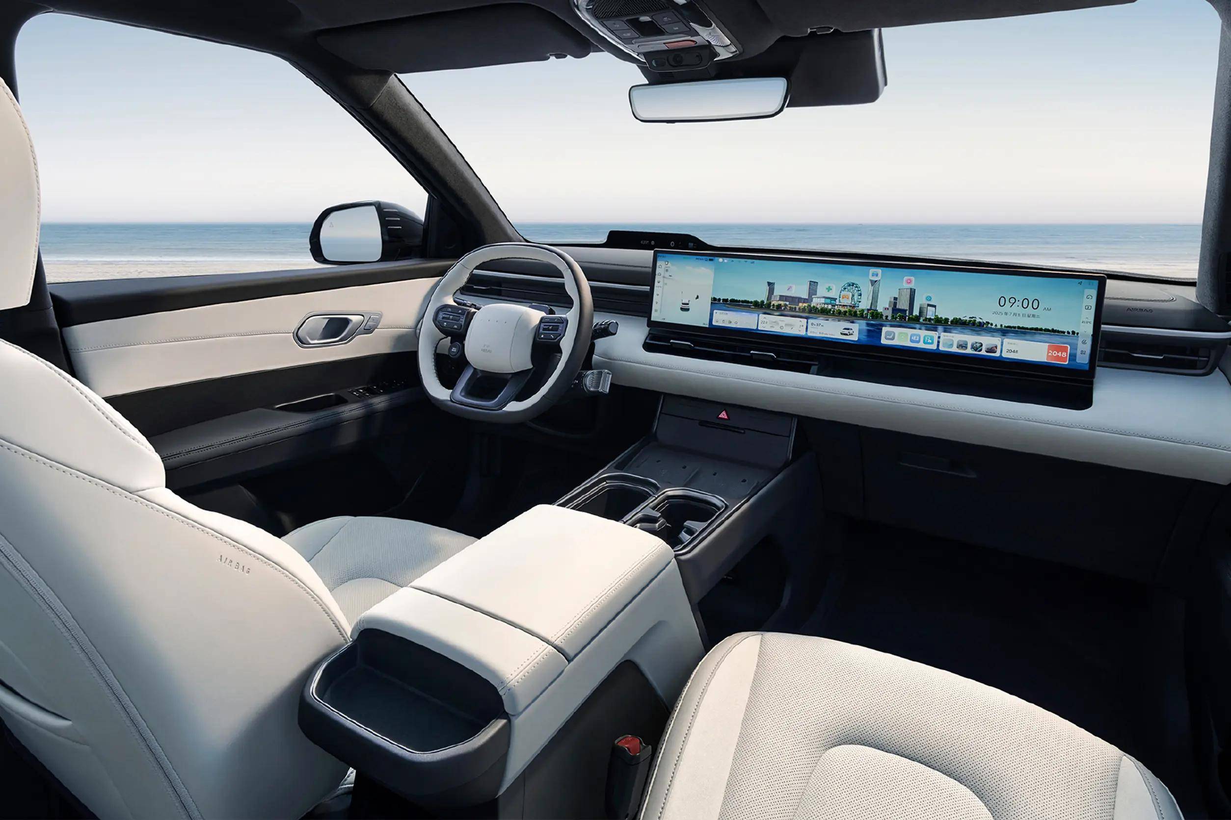 内饰布局打破传统设计框架,27英寸4K双联屏横跨中控与副驾区域,配合双无线充电面板和悬浮式中央操控台,形成简洁科技风格。值得注意的是,该车取消了传统液晶仪表,改用远端抬头显示系统,使驾驶员无需低头即可获取行车信息。储物空间设计同样独具匠心,中控台通道配备伸缩盖板储物格和四杯架,后门把手处设置独立杯架,后排空调出风口则移至B柱位置,兼顾实用性与美观性。