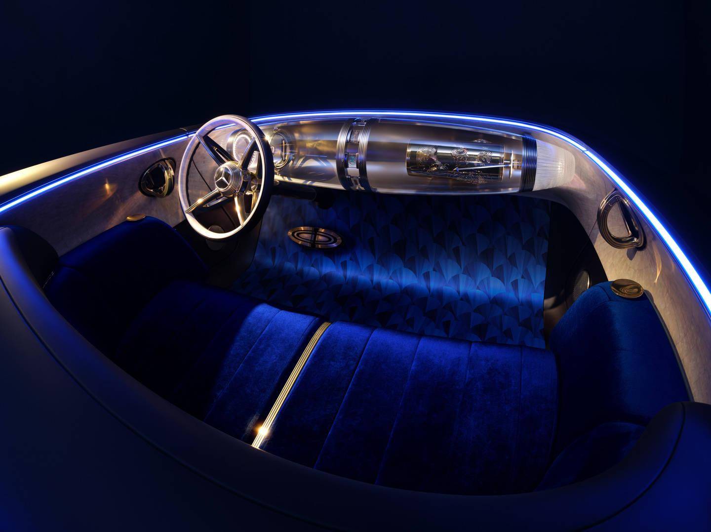 内饰空间以装饰艺术(Art Deco)风格为基调,仪表台中央的悬浮式"齐柏林(Zeppelin)"玻璃结构成为科技与复古的融合点。设计师通过专属材质与精湛工艺,营造出贵宾休息室般的乘坐体验。这种设计理念源于对自动驾驶发展趋势的洞察,数字豪华座舱将舒适性与功能性提升至全新高度。