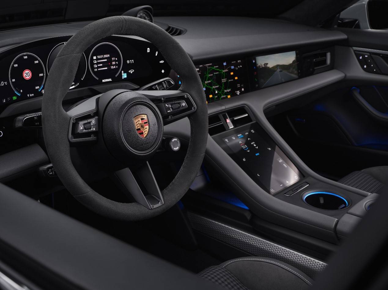 座舱设计延续“驾驶者中心”理念,全液晶仪表、中控主屏与独立空调控制屏构成的三联屏系统成为标准配置。车内广泛采用翻毛皮材质包裹,兼顾运动质感与乘坐舒适性。配置梯度呈现清晰分层:入门车型标配真皮加热GT运动方向盘、14向电动调节记忆座椅、BOSE环绕音响及Sport Chrono组件;高配车型升级为带模式切换旋钮的GT多功能方向盘、18向电动调节自适应运动座椅,并配备Burmester高端3D环绕音响与仪表板罗盘显示屏。此次改款的最大亮点在于影音系统升级,标准版与GTS车型新增杜比全景声技术,使两大音响系统均能实现沉浸式声场效果,同时USB快充接口新增电源共享功能,可反向为移动设备供电。