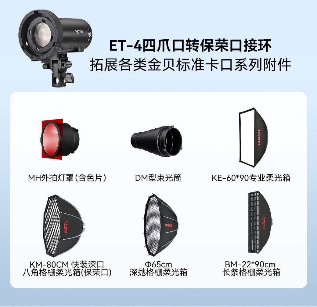此外HD100外拍闪光灯采用了金贝迷你四爪附件卡口的设计,和HD2PLUS同样兼容丰富的金贝快装类塑光附件,省去了“专灯专用”的额外成本。还能通过附件转保荣口支架,支持更多附件满足多种需求。