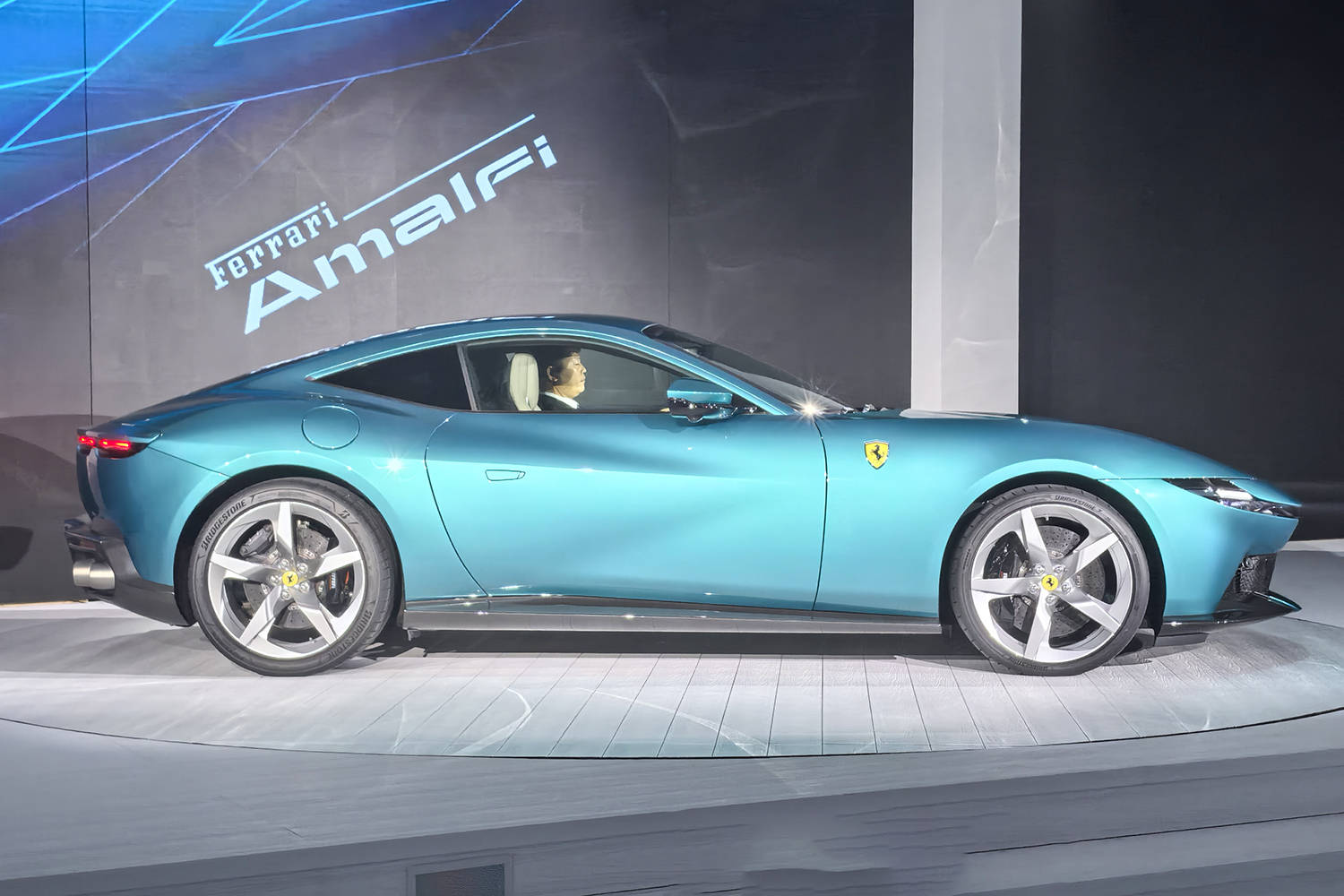 设计团队从Speedform项目车型中汲取灵感,以浑然一体的流线造型赋予Amalfi蓄势待发的动态美感。车身采用雕塑般的立体型面与纯粹利落的车身轮廓,前部大尺寸进气口与修长发动机罩形成视觉焦点,配合锻造轮毂与碳纤维装饰件,在动感与精致间取得完美平衡。车尾设计同样令人惊艳,主动式扰流板不仅提升高速行驶稳定性,更与环绕式线条共同勾勒出简约凝练的尾部轮廓,隐匿式尾灯设计则彰显了法拉利对细节的极致追求。