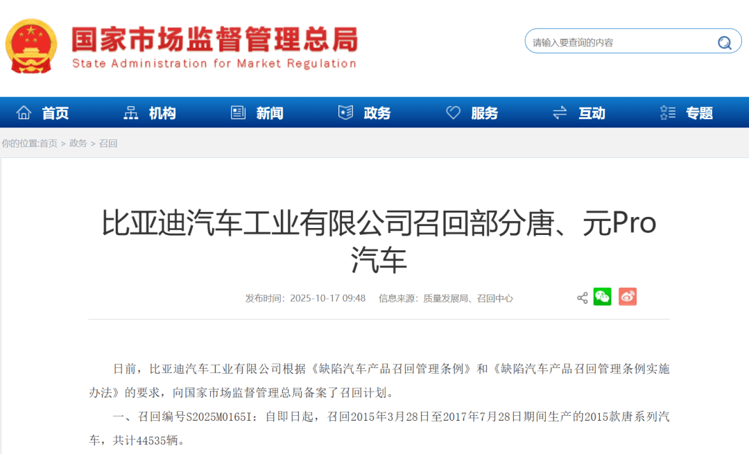 国家市场监督管理总局官网披露,比亚迪汽车工业有限公司依据《缺陷汽车产品召回管理条例》及其实施办法,已向监管部门提交召回备案计划,涉及两款车型的批量召回。