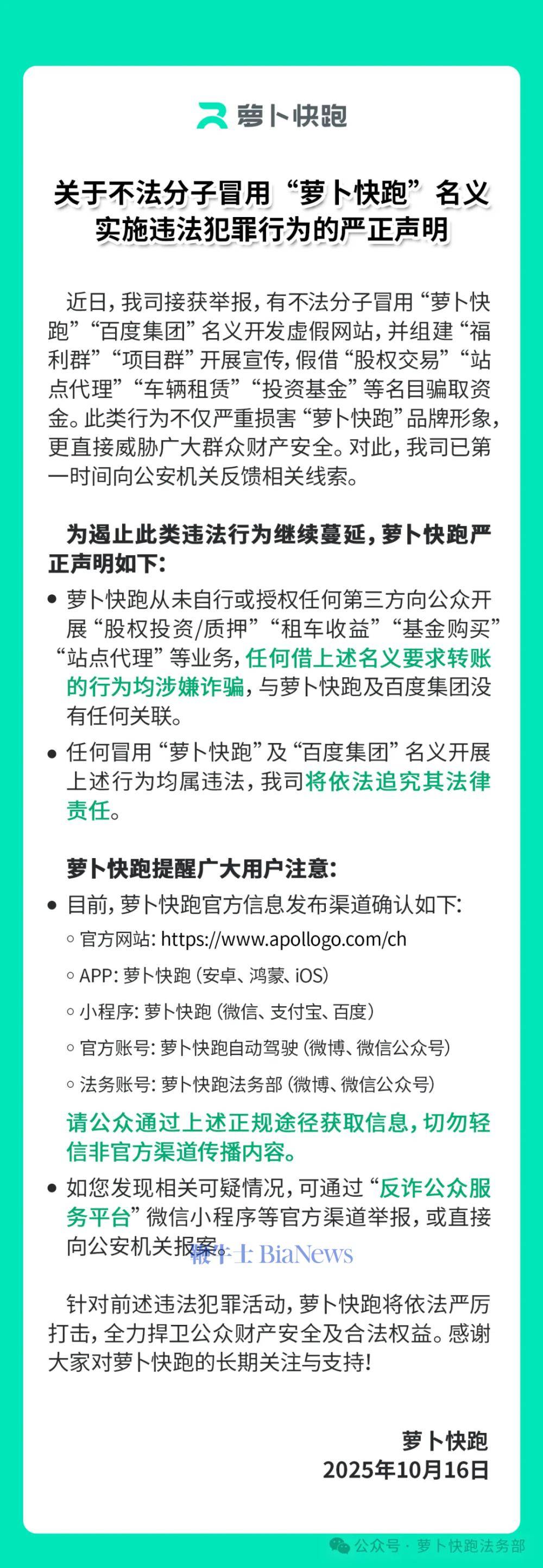 萝卜快跑发布声明:不法分子冒名建虚假网站,以多种名目骗取群众资金