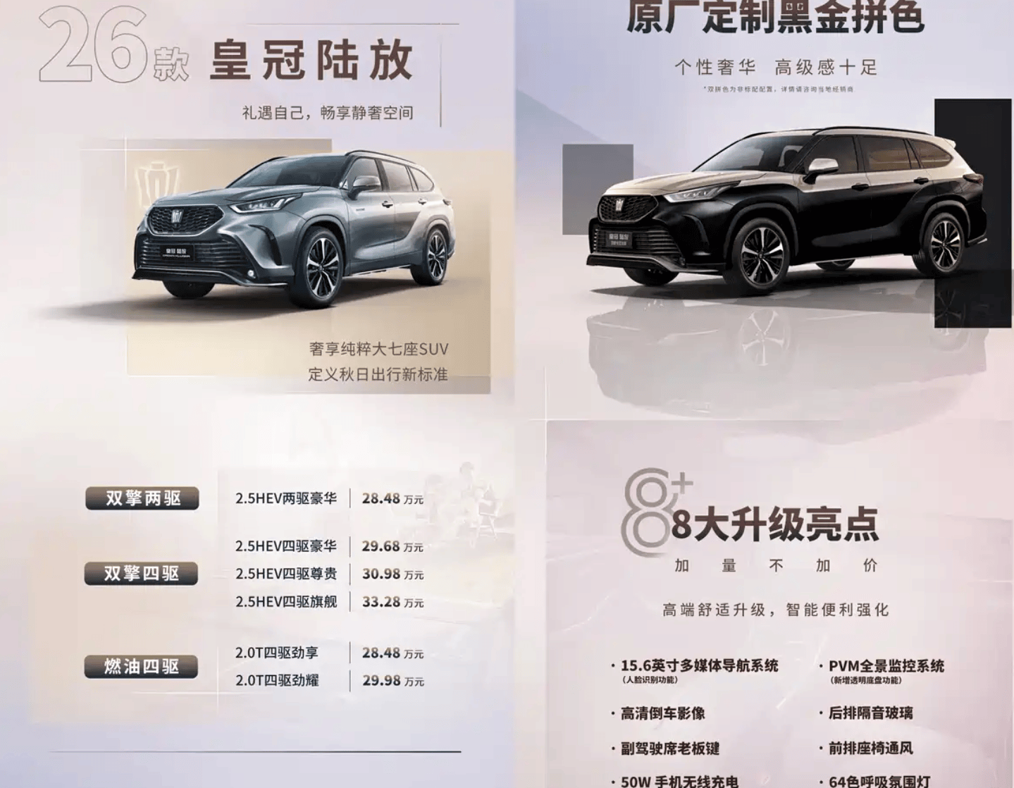 动力系统提供双擎驱动方案:2.0T涡轮增压发动机可输出182千瓦最大功率,峰值扭矩达380牛·米,匹配8速手自一体变速箱与适时四驱系统,适合追求驾驶激情的用户;2.5L油电混动版本则以181千瓦系统综合功率实现高效输出,两驱/四驱车型均搭载E-CVT电子无级变速箱,在保证动力响应的同时,将燃油经济性提升至新高度。前排座椅通风功能的标配,进一步强化了全场景的驾乘舒适性。