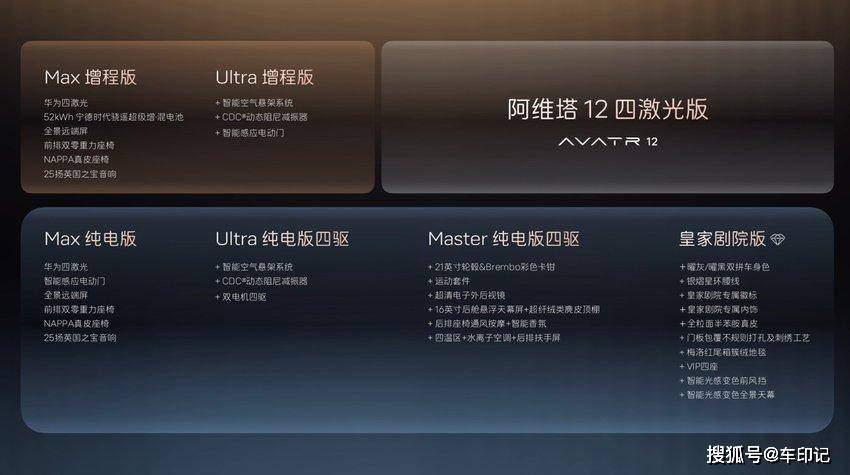 动力与底盘方面,阿维塔12四激光版提供纯电与增程双动力选择,全面覆盖用户多元出行场景。纯电动后驱版CLTC续航里程可达755km,轻松应对跨城出行;四驱版0-100km/h加速仅需3.8s,性能媲美4.0T V8发动机,带来酣畅淋漓的驾驶体验。增程版全系标配52kWh大容量宁德时代骁遥超级增·混电池,CLTC纯电续航里程356km,可轻松实现“一周一充”的城市纯电通勤自由;综合续航里程突破1270km,配合5C峰值充电倍率,电量从30%充至80%仅需10分钟,一杯咖啡的时间便可完成补能,带来“增程体验更纯电,续航表现更燃油”的无忧体验。同时,新车底盘系统也进行了重要升级,针对空悬版车型进行了底盘优化与精细化调校,舒适性与操控性同步提升,面对复杂路况也能从容应对。